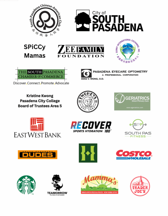 SPiCCy Mammas, Zee Family Foundation, East West Bank, W Geriatrics, So Pas Chamber of Commerce, Sunny International, Kristine Kwong PCC Board of Trustees Area 5, Pasadena Eyecare Optometry Dr Mike Wong, Twoheys, Mamma’s Pizza, TeaMorrow, Costco, Starbucks, Trader Joes, Recovery 180, South Pasadena Fitness, Huntington Library and Garden, DUDES, and SPHS Tiger Booster Club.